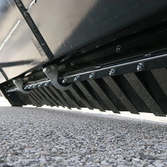 Via en flödesventil kan sedan hastigheten på utmatningen regleras steglöst. Beroende på storleken på materialet som ska spridas ut justeras trycket av den fjäderbelastade gummiduken mot utmatningsvalsen.
