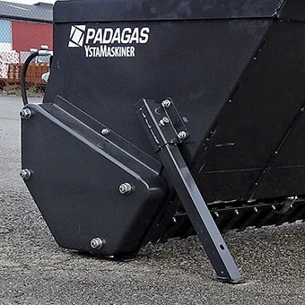 När sandspridaren inte längre ska användas fälls stödbenen ned så att spridaren kan stå stabilt. Detta är fördelaktigt då man inte behöver ha någon form av ställning till sandspridaren eller oroa sig för att den kan välta.