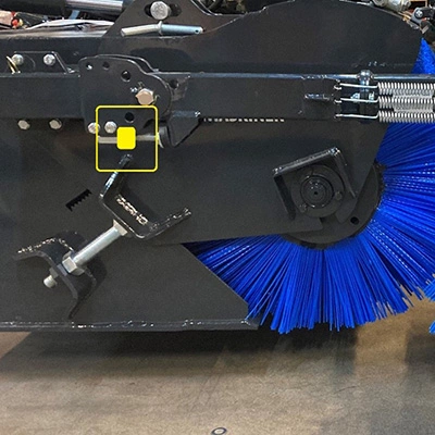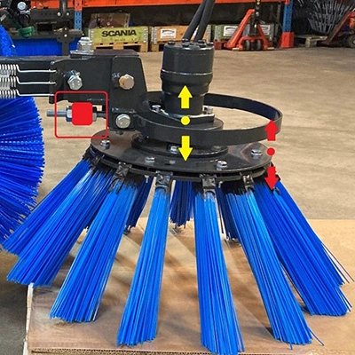 Den gulmarkerade bulten med kontramutter (under infästningen) ställer borsthuvudets placering i höjdled. Bild 2