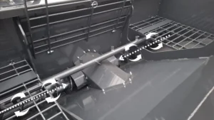 mitten via två kraftiga matarvalsar, hastigheten på utmatarvalsen regleras steglöst genom traktorns hydraulik. En