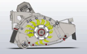 GreenTecs nya stora slaghackshuvud FR är tillverkat i Strenx® 700 höghållfasthets konstruktionsstål vilket optimerar slaghackens vikt- och styrkeförhållanden. Designen på slaghacken kallas för “Integrated Airflow” och skapar ett naturligt vakuum för att materialet ska passera genom huvudet snabbt och därmed öka kapaciteten med 25 % men med ett mindre effektbehov. Totalbredden på slagklipparen är mindre än tidigare eftersom rotoraxelns lager är integrerade i rotorn.