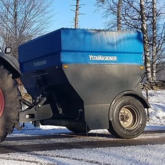 • SandspridareSandspridare YSTA för torrt material Sandspridare YSTA är hydrauliskt driven och finns som buren och bogserad modell. De burna modellerna monteras på traktor eller lastmaskin för spridning av sand, salt och stenflis och finns i sex olika modeller med lastvolymer från 400 till 3000 liter och med spridningsbredder mellan 1,25 – 2,4 meter. Den bogserade modellen finns i tre olika modeller med lastvolymer från 4000 till 9000 liter med en spridningsbredd på 2,24 meter.
